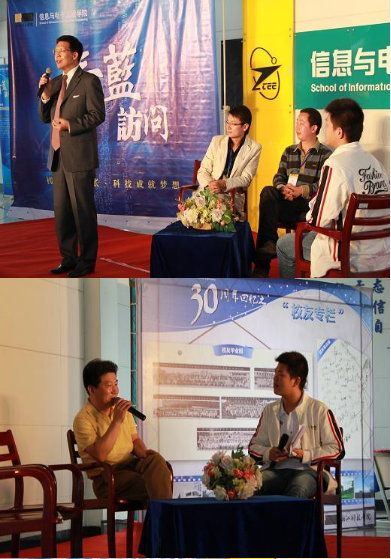 2010年10月7日下午两点,由信息学院主办的校庆系列节目青蓝访问第二期在C1大厅顺利进行。参加此次访问的嘉宾分别是毕业于80,90以及00年代的信息学院校友代表。到场的还有信息学院院长张森老师、党总支书记杨春亭老师、常务副院长郑志军老师、副院长叶绿老师、党总支委员蒋邢飞老师和全体辅导员老师,以及10级新生代表。