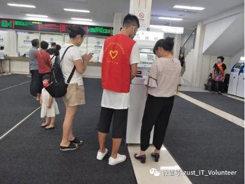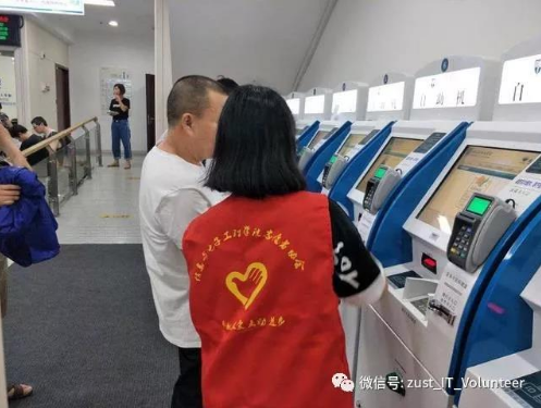 为减小挂号带来的压力,同德医院安放了许多自助挂号机来分摊人流量。但是,许多人还不会使用这个终端机,需要人指导他们使用。志愿者们还能在大厅为患者指路,提高服务效率。